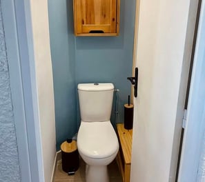 La salle de bain comprend une douche et un lave-linge/sèche-linge. Les WC sont séparés.
