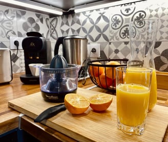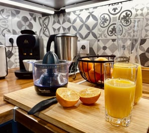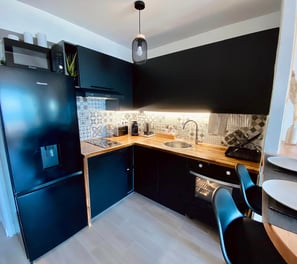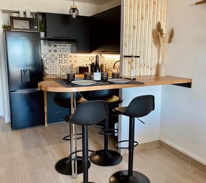La cuisine ouverte sur le salon est équipée d'un grand réfrigérateur avec un grand congélateur, un micro ondes, un four, deux plaques de cuisson, vaisselle, divers verres (vin, eau, bière, cocktail) d'une batterie de casseroles ainsi que d'ustensiles de cuisine. Vous trouverez également une machine à expresso capsules, une bouilloire, un grille pain ainsi qu'un presse agrumes.