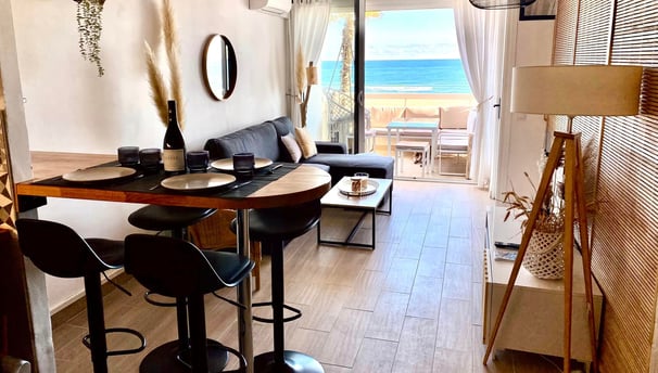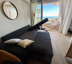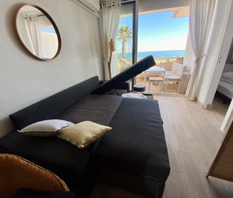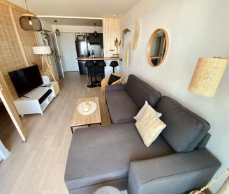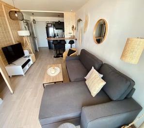 Le salon, avec un canapé convertible de qualité (140 x 120), est équipé d'une télévision connectée de 108 cm. L'appartement dispose de la climatisation réversible et du Wifi.
