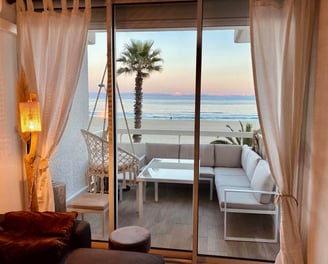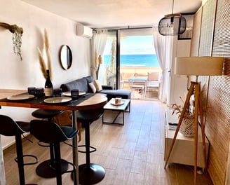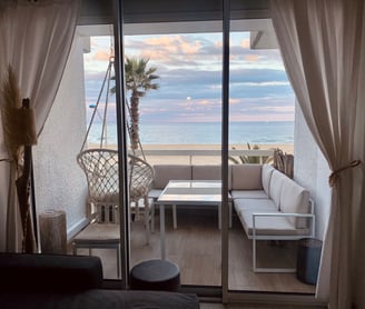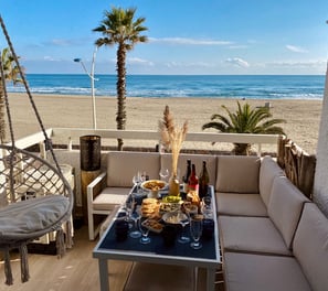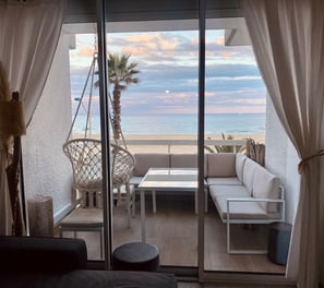 Le salon est ouvert sur la terrasse (possibilité d'ouvrir la baie vitrée de 2/3). La terrasse de 6m2 dispose d'un fauteuil suspendu ainsi que d'un grand salon de jardin avec table. Idéal pour prendre le petit déjeuner, l'apéro ou pour se relaxer au soleil levant !